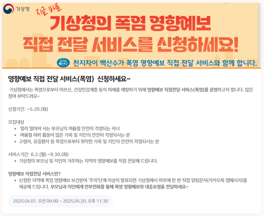 기상청은 신청한 지역에 **‘폭염 영향예보 보건 분야 - 주의 이상 단계’**가 발표되면,