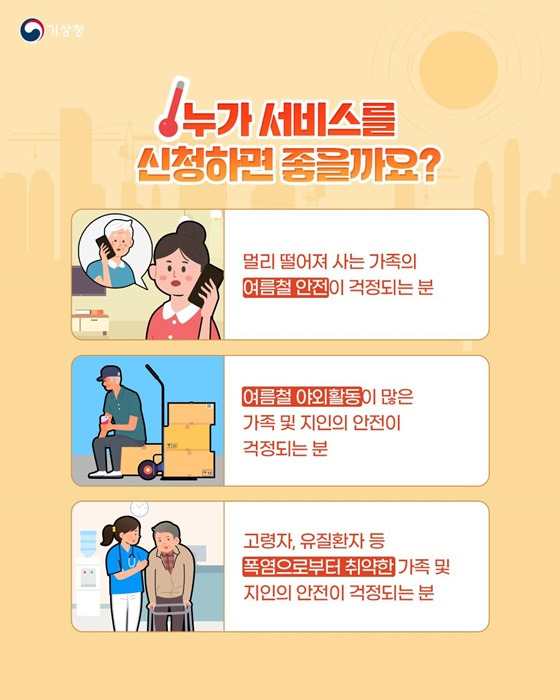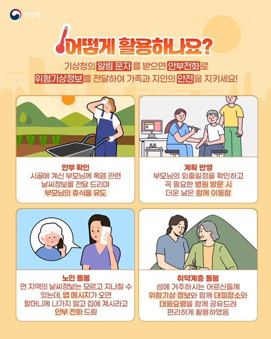 기상청에서는 이러한 국민들의 걱정을 덜어드리기 위해 ‘폭염 알림 + 안부전화’ 서비스를 제공하고 있습니다.