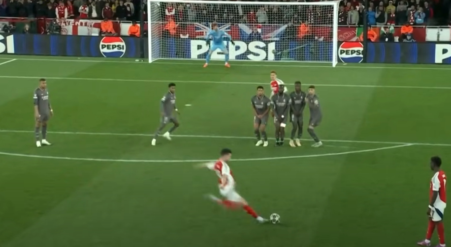 후반전이 시작되자 아스널이 본격적으로 공격 모드로 전환했습니다. 후반 13분, 부카요 사카의 돌파 과정에서 다비드 알라바가 반칙을 범하며 페널티 박스 근처에서 프리킥 기회를 얻었습니다. 이 찬스를 놓치지 않은 데클런 라이스가 강력하고 정교한 킥으로 선제골을 기록하며 아스널의 분위기를 끌어올렸습니다.