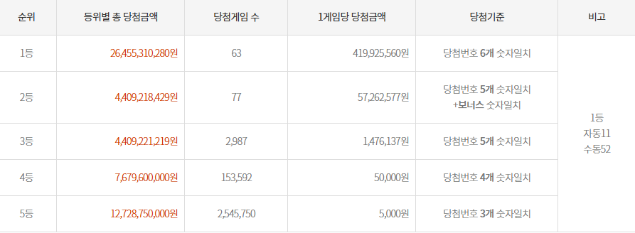이번 추첨에서 당첨 번호 5개와 보너스 번호를 맞춘 2등은 77명으로, 각기 5726만 2577원을 받게 됩니다. 5개 번호를 맞춘 3등은 2987명으로, 147만 6137원의 당첨금을 받습니다. 당첨 번호 4개를 맞춘 4등은 15만 3592명으로 고정당첨금 5만 원을, 당첨 번호 3개가 일치한 5등은 254만 5750명으로 고정당첨금 5000원을 받습니다.