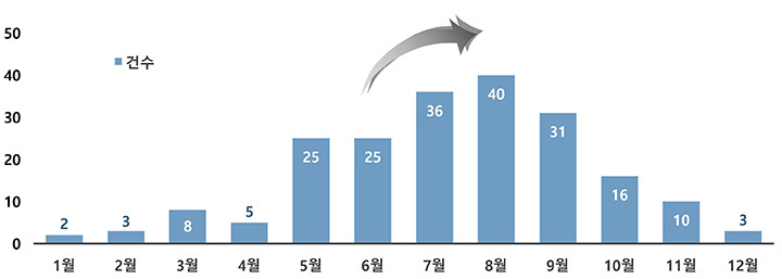 특히 7월~9월 사이, 전체 발생 건수의 절반 이상(52%)이 집중되는 것으로 나타났습니다. 계절적으로도 지금이 가장 위험한 시기입니다.