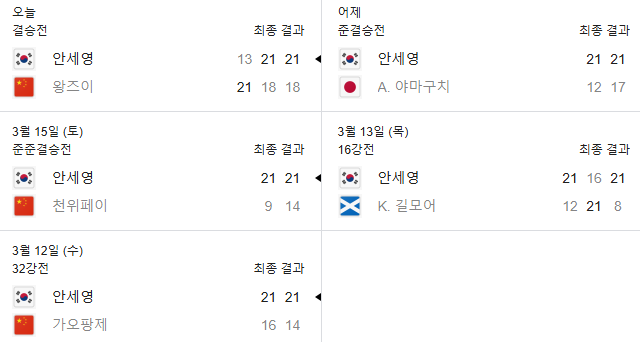 안세영 선수는 이번 결승전까지 32강에서 가오팡제(중국·15위), 16강에서 커스티 길모어(스코틀랜드·33위), 8강에서 천위페이(중국·13위), 4강에서 야마구치 아카네(일본·3위)를 순서대로 제압하며 인상적인 우승 행진을 이어갔습니다.