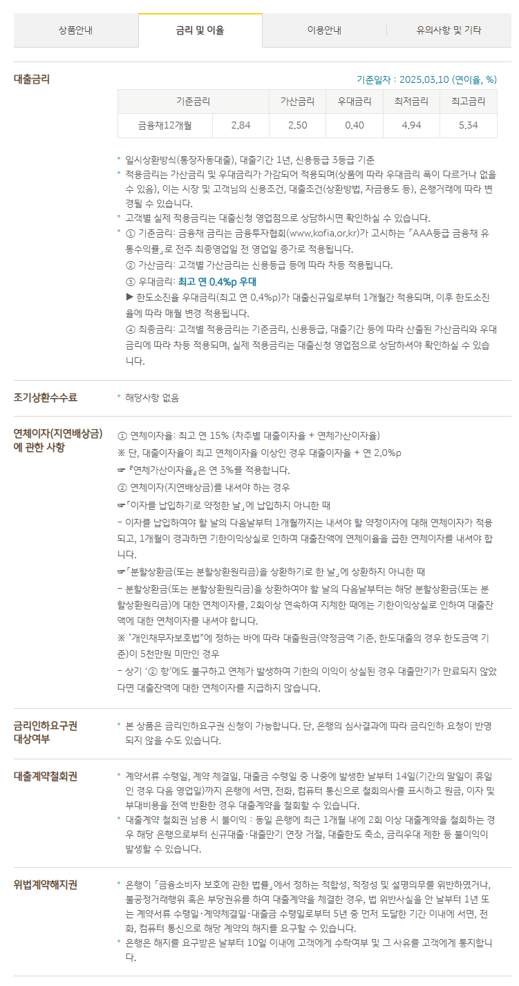- 대출 금리: 연 4.94%에서 5.34% 사이로 비교적 안정적인 금리 수준을 유지하고 있습니다.