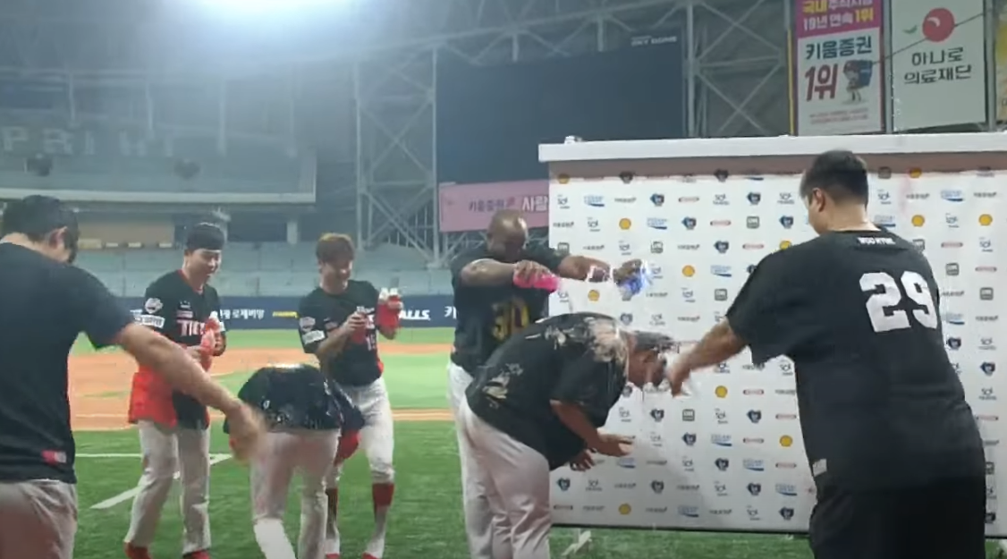 김도영의 대기록 달성을 축하하기 위해 KIA 타이거즈 선수들은 경기 후 다 함께 축하 세리머니를 준비했습니다. 주장 나성범이 준비한 케이크와 양현종을 비롯한 동료들이 준비한 물세례는 김도영을 더욱 빛나게 했습니다. 김도영은 케이크와 물로 온몸이 젖었음에도 불구하고 팬들에게 감사 인사를 잊지 않았습니다.